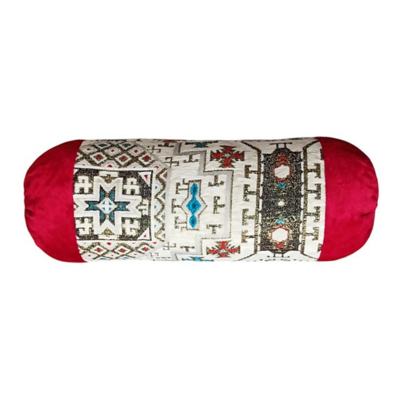 کاور متکا با ابعاد قطر 14cm و طول 42cm.جنس کناره مخمل و جنس وسط کار شانل لمه دار.یه طرف کار بسته و طرف دیگر بند گذاشته شده که داخل کار را با الیاف پر کرده و بعد از آن با بند کاملا جمعش کنید