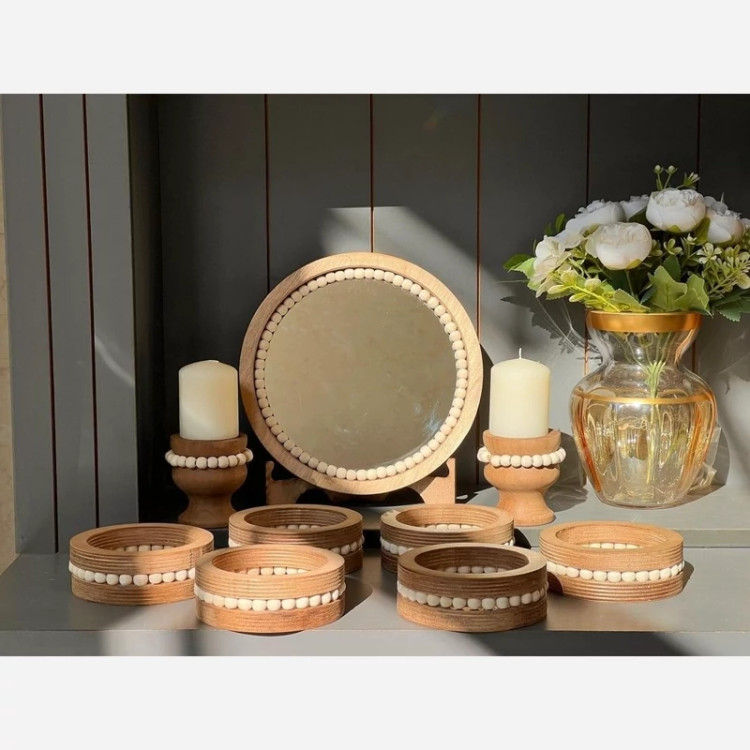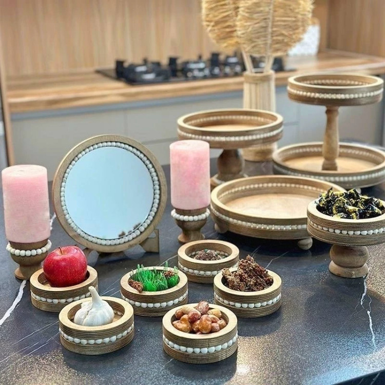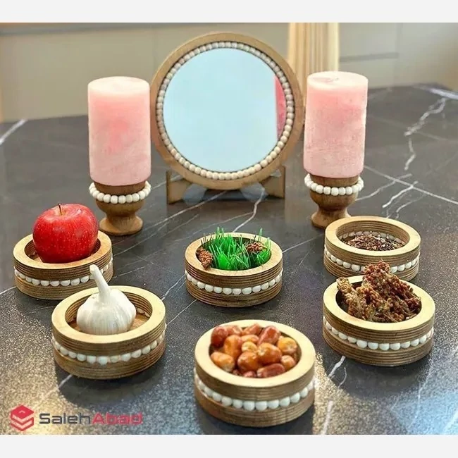 هفت سین چوبی مهره دار با آینه و شمعدان