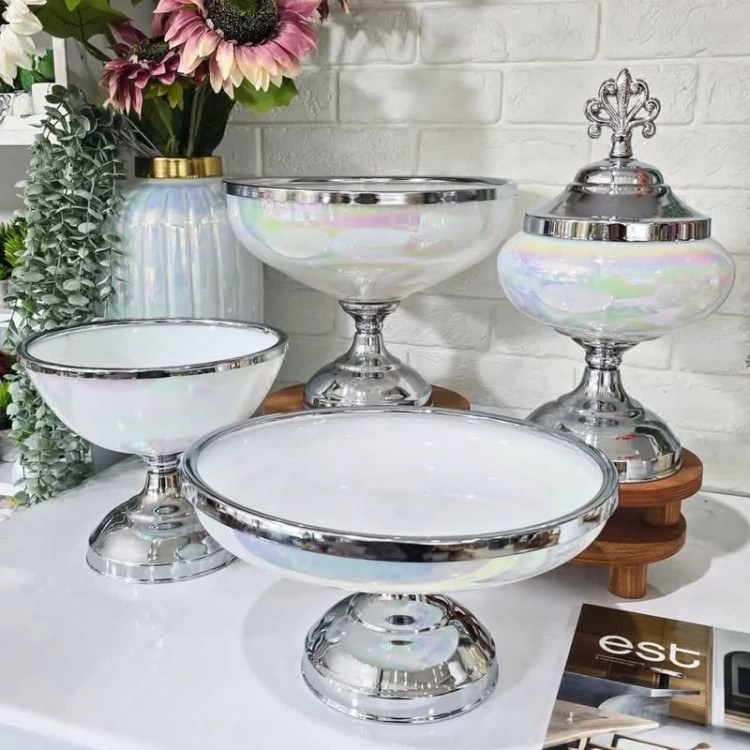 سرویس ۴ تکه کاراملی پذیرایی شیشه ای استیل رنگ ثابت شامل شکلات خوری،میوه خوری،آجیل خوری،شیرینی خوری