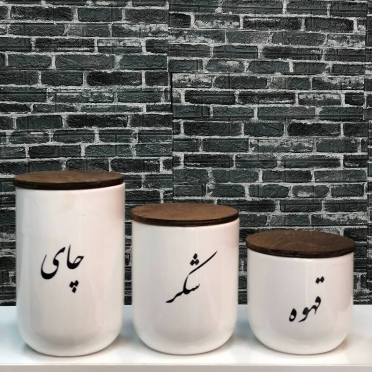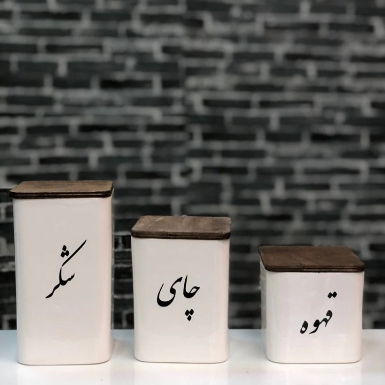 کندی سه سایز چای شکر قهوه در سه سایز مختلف سرامیکی در چوبی در طرح گرد و مربع