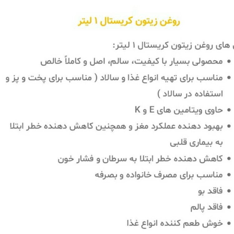 روغن زیتون Kristal محصولی کیفی و مفید از کشور ترکیه با بکارگیری زیتون های تازه و خوش طعم تولید گردیده و دارای کیفیتی فوق العاده است. استفاده از این محصول طعمی عالی به غذاها و انواع سالاد می دهد و لذت داشتن یک وعده غذایی فوق العاده و با نشاط را به شما و عزیزانتان هدیه می کند.
