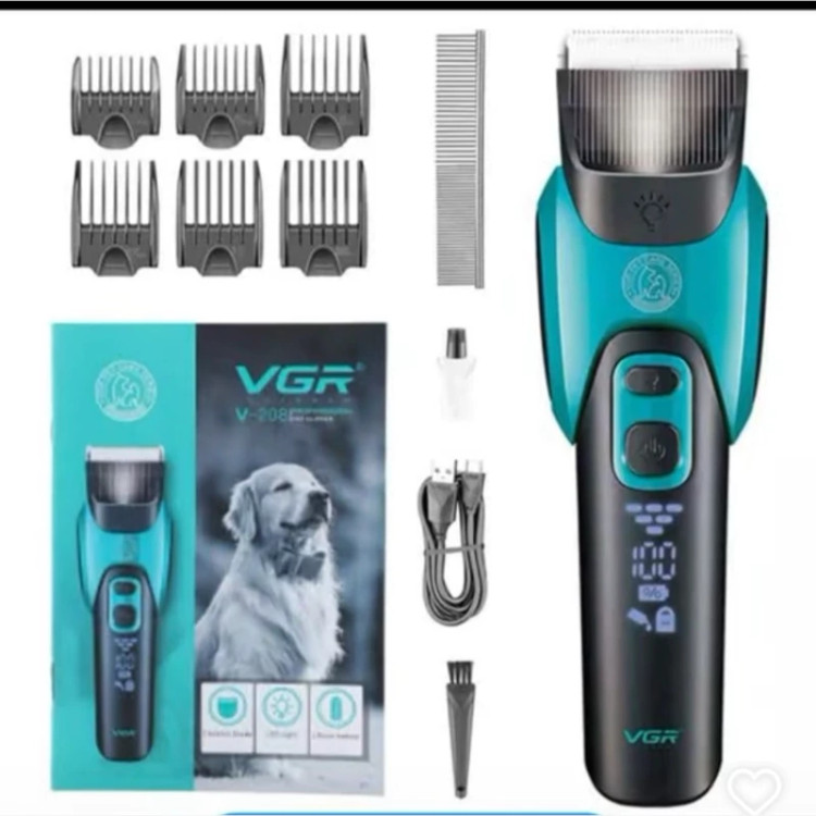 صفحه نمایش LED، نمایش قدرت باتری / وضعیت شارژ / قفل ایمنی و غیره\r\n2. موتور 10W با قدرت بالا برای برش سریع\r\n3. تیغه از جنس استنلس استیل، ایمن و بدون آسیب به دست\r\n4. لرزش کم و طراحی کم سر و صدا\r\n5. رابط USB، می تواند برای شارژ یا اتصال مستقیم استفاده شود\r\n\r\nپارامتر\r\n1. جنس تیغه: فولاد ضد زنگ سرامیکی\r\n2. قدرت: 10 وات\r\n3. روش تمیز کردن: شستشوی تیغه ها با آب\r\n3. ظرفیت باتری : 2000mAh\r\n4. زمان استفاده: 90 min\r\n5. روش شارژ: USB\r\n6. لوازم جانبی: 6 شانه راهنما، برس تمیز کردن، شانه حیوانات خانگی، کابل شارژ USB، دفترچه راهنمای کاربر\r\n\r\nجنس تیغه فولاد ضد زنگ ارتقا یافته این ماشین اصلاح حیوانات برای محافظت از حیوان خانگی مورد علاقه شما در برابر آسیب بسیار ایمن است.حتی اگر مبتدی هستید، می توانید با خیال راحت حیوان خانگی خود را اصلاح کنید.صدای کم و قدرت قوی ماشین اصلاح vgr v-208 حیوانات خانگی با موتور 10 وات، لرزش کم و طراحی فوقالعاده بیصدا، به اندازه کافی قدرتمند میباشد برای اصلاح موهای ظریف، کوتاه و درشت.صدای کار کمتر از 50 دسی بل است، حیوانات خانگی دیگر از اصلاح نمی ترسند.تجربه بی سیم : باتری لیتیوم یونی با ظرفیت 2000 میلی آمپر، که می تواند 1.5 ساعت با یک بار شارژ دوام بیاورد.