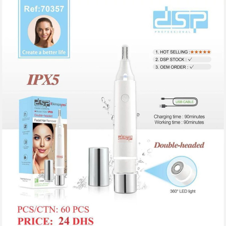 ماشین اصلاح صورت دی اس پی مدل 70357، دستگاهی دوکاره با قابلیتهای حذف موهای صورت و موزن سبیل است. با توان 3 وات و باتری لیتیوم-یون، این دستگاه ضد آب (IPX5) است و دارای پورت شارژ Type-C برای شارژ سریع میباشد. زمان شارژ و استفاده هر کدام 90 دقیقه است. به همراه دستگاه، برس، کابل Type-C و دفترچه راهنما ارائه