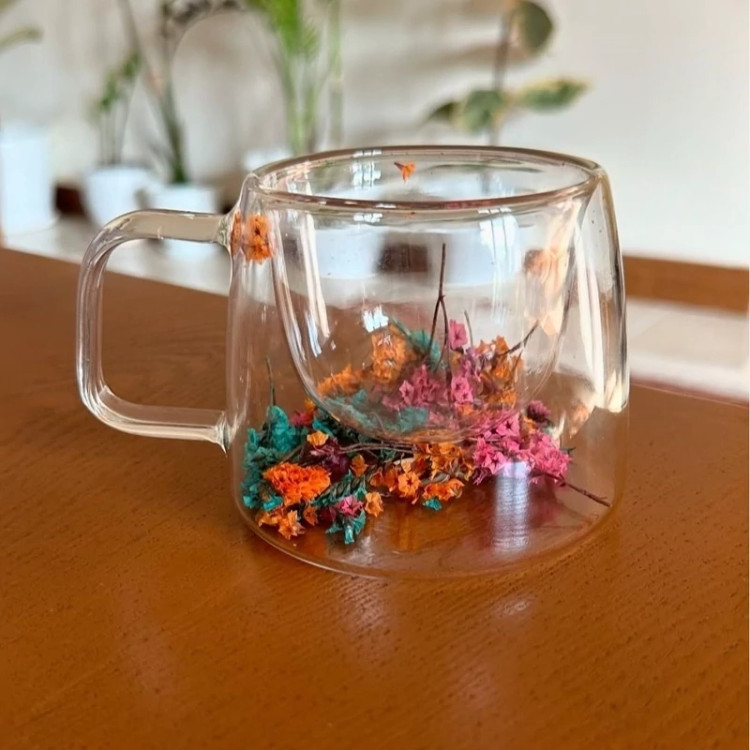 لیوان دوجداره پیرکس کف پهن طرح گل خشک