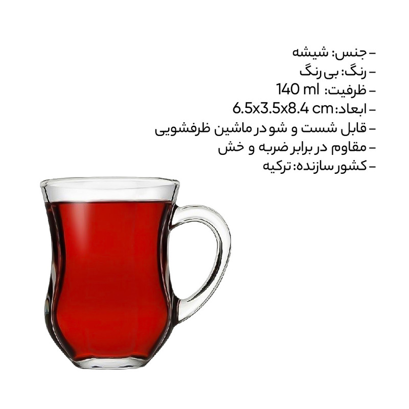 سایر توضیحات : - ست شش عددی استکان دسته‌دار - مناسب برای سرو چای، قهوه و... - ابعاد هر استکان: قطر دهانه 6.5، قطر سطح مقطع 3.5، ارتفاع 8.4 سانتی‌متر - طول هر استکان با احتساب دسته 9 سانتی‌متر - وزن تقریبی هر استکان 194 گرم