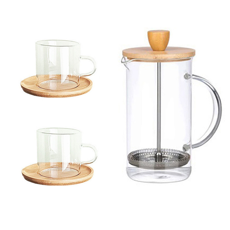 ست شامل یک عدد فرنچ پرس 6000 میلی و دوعدد فنجان پیرکس 200 میلی و دو عدد نعلبکی بامبو به قطر 12 سانت می باشد.