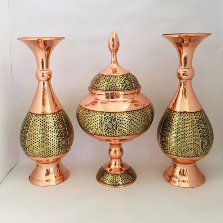 ست خاتم کاری شکلات خوری و یک جفت گلدان 25 سانتی صنایع دستی سایروس ست هدیه مس و خاتم