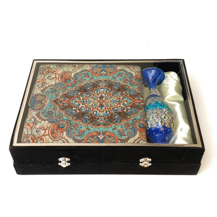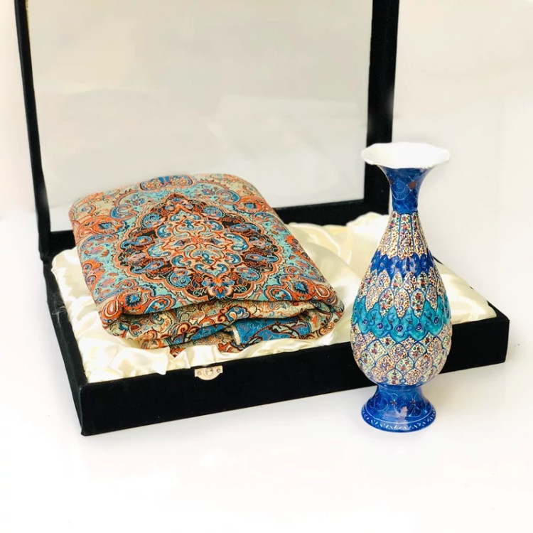 ست هدیه صنایع دستی ست گلدان مینا کاری و ترمه یک متری و جعبه جیر هدیه و کادویی سازمانی صنایع دستی سایروس