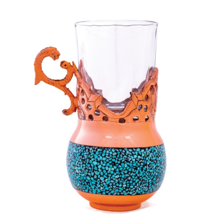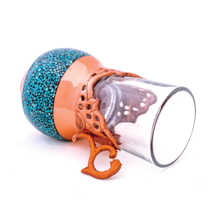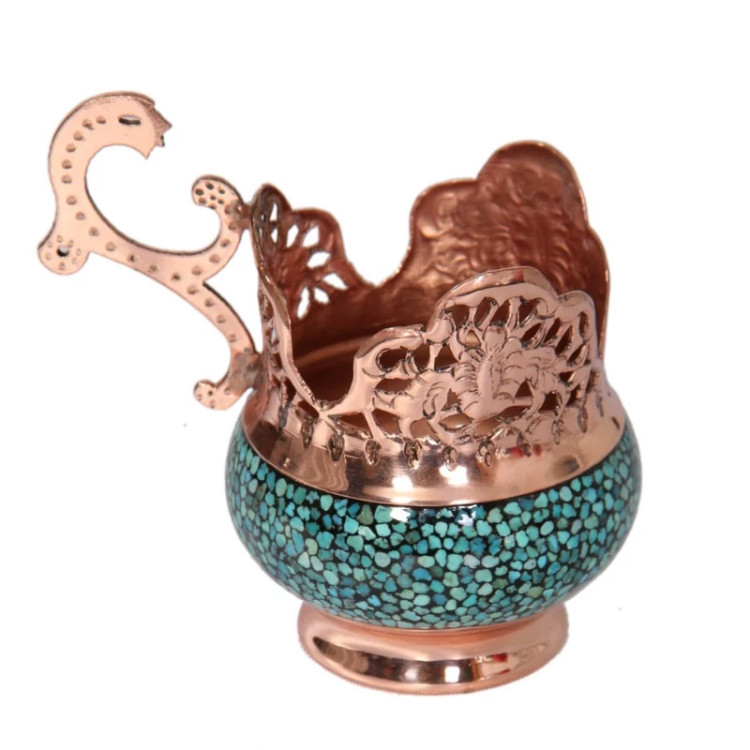 گالش فیروزه کوبی قلم زنی شده و لب شبکه ای پک 6 عددی برای چایی خوری و سرویس و پذیرایی فیروزه کوبی نیشابور صنایع دستی