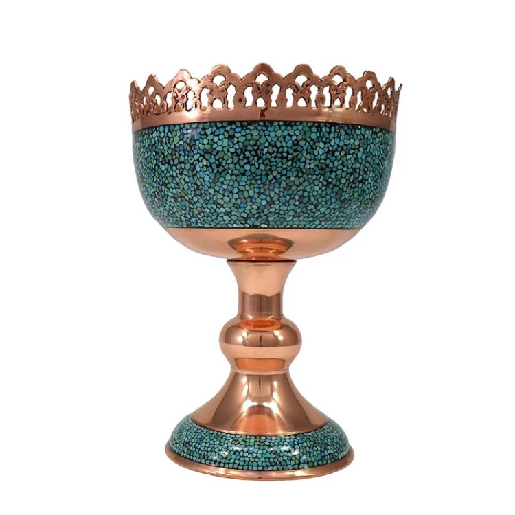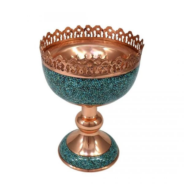 آجیل خوری فیروزه کوبی قلم زنی شده و لب شبکه ای 25 سانتی میوه خوری فیروزه کوبی نیشابور صنایع دستی سایروس