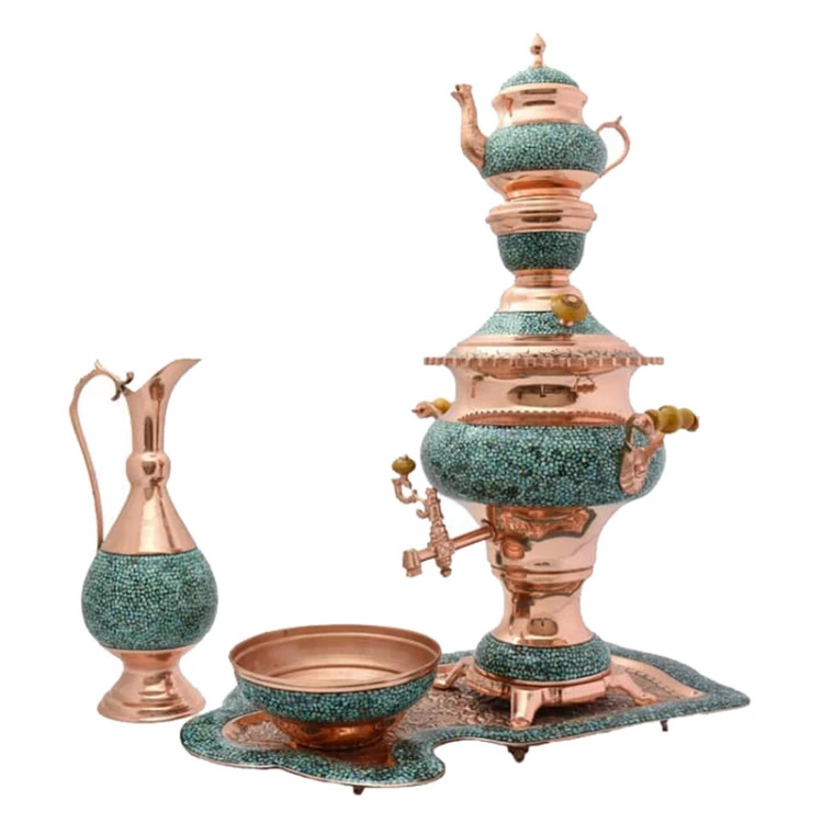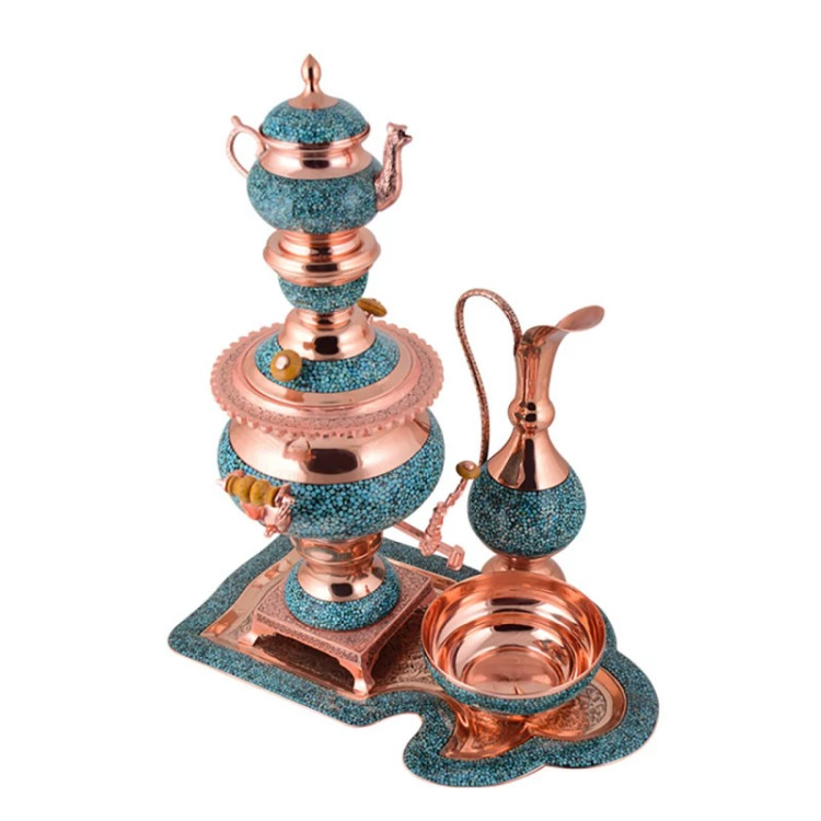 سماور فیروزه کوبی 4 لیتری 65 سانتی مس و فیروزه کوبی سرویس سماور فیروزه کوبی نیشابور صنایع دستی سایروس