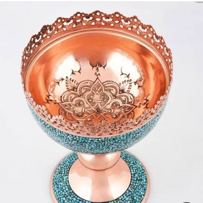 آجیل خوری فیروزه کوبی سوپر 50 سانتی قلم زنی شده و لب شبکه ای. میوه خوری فیروزه کوبی نیشابور صنایع دستی سایروس