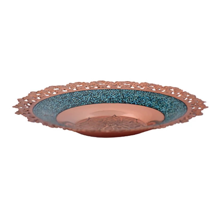 پشقاب فیروزه کوبی 20 سانتی مس و فیروزه کوبی نیشابور و لب شبکه ای قلم زنی شده صنایع دستی سایروس