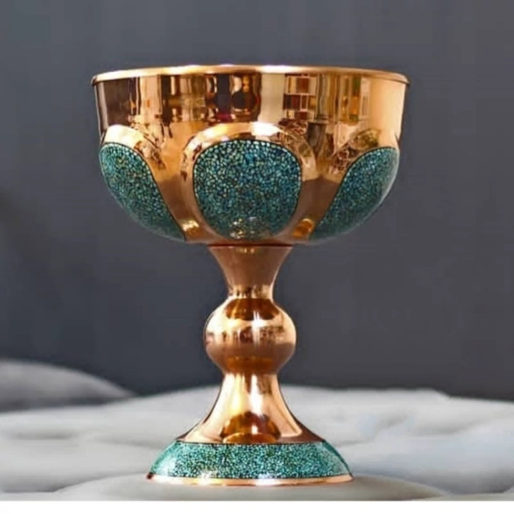 سنگ آب قل دار یا سنگاب فیروزه کوبی 16 سانتی مس و فیروزه کوبی نیشابور سنگاب فیروزه صنایع دستی سایروس مسی یا آجیل خوری