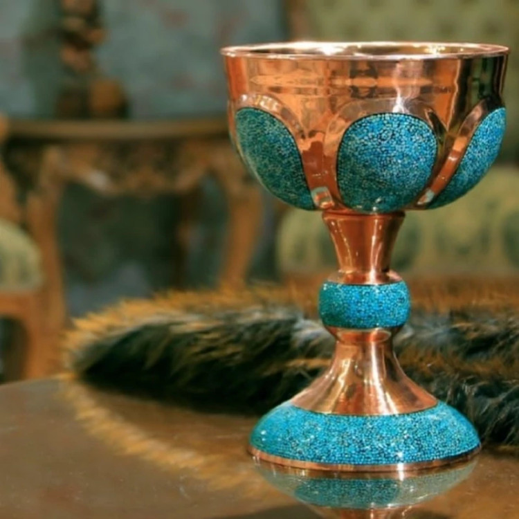 سنگ آب قل دار یا سنگاب قل دار مس و فیروزه کوبی نیشابور 20 سانتی یا آجیل خوری فیروزه کوبی صنایع دستی سایروس فیروزه کوبی