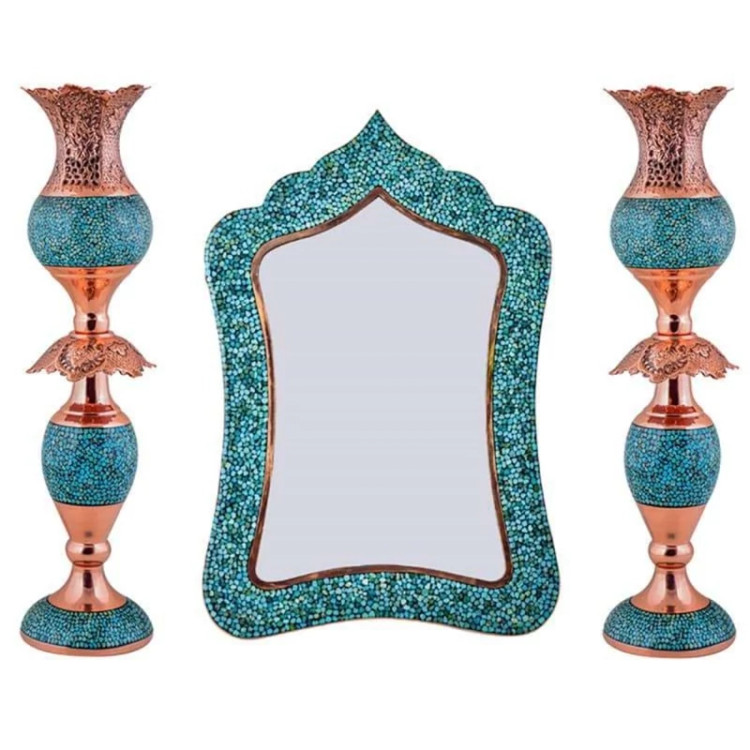 ست سه تکه لاله و آینه 36 سانتی مس و فیروزه کوبی نیشابور قلم زنی شده و لب شبکه ای دکوری و هفت سین اینه و شمعدان سایروس