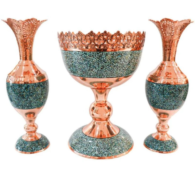ست سه تکه فیروزه کوبی سرویس سنبلدان یا گلدان و آجیل خوری 25 مس و فیروزه کوبی نیشابور صنایع دستی سایروس