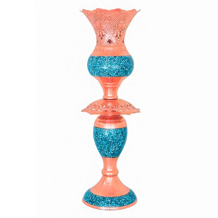 لاله فیروزه کوبی 35 سانتی قلم زنی شده و لب شبکه ای مس و فیروزه کوبی نیشابور صنایع دستی سایروس چراغ نفتی فیروزه کوبی