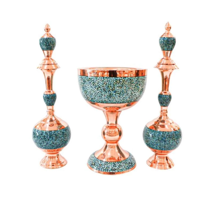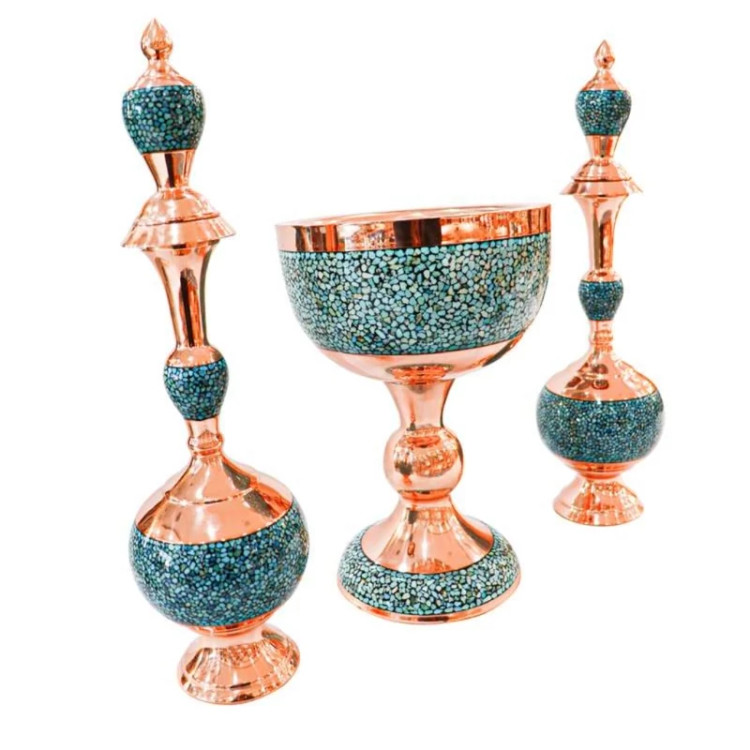 ست سه تکه تنگ گیلاسی یا تنگ شاهی و سنگ آب مس و فیروزه کوبی نیشابور سنگاب فیروزه صنایع دستی سایروس
