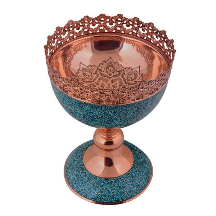 آجیل خوری فیروزه کوبی 33 سانتی قلم زنی شده و لب شبکه ای میوه خوری فیروزه کوبی یا کاسه پایه فیروزه صنایع دستی سایروس