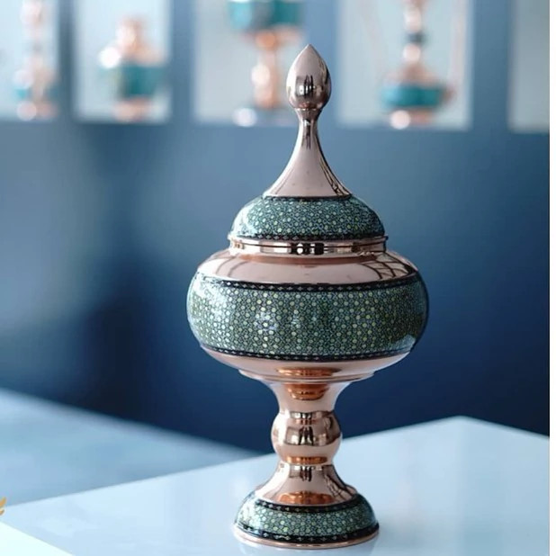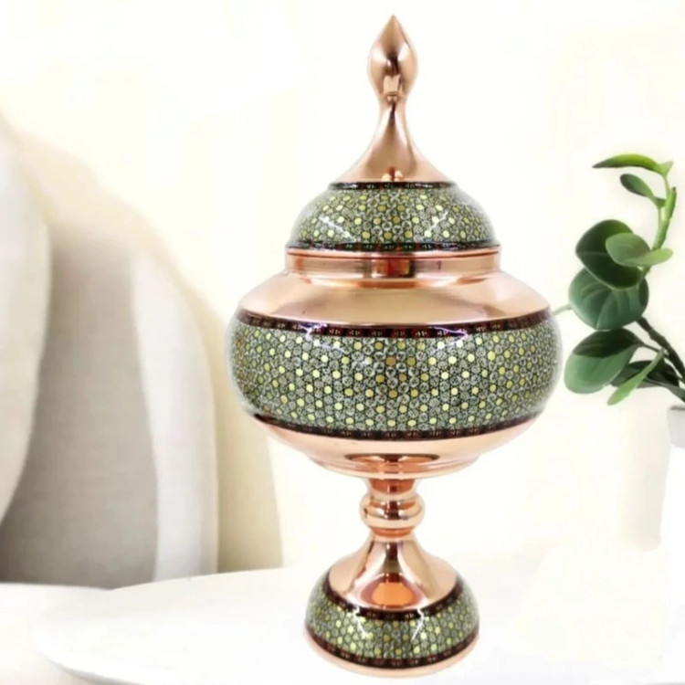 شکلات خوری خاتم 26 سانتی شکلات خوری مس و خاتم قندان پایه دار خاتم یا گز خوری صنایع دستی سایروس