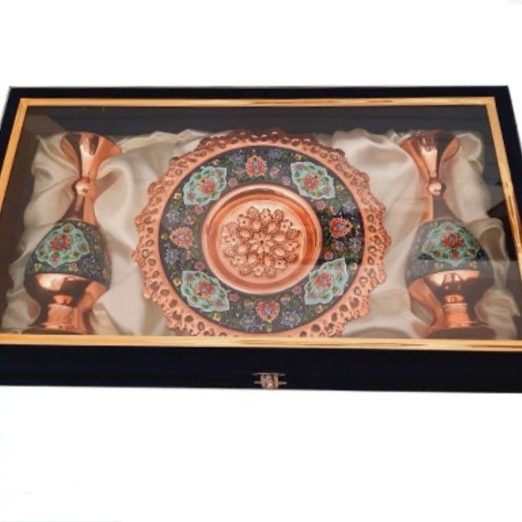 ست سه تکه گلدان و پشقاب مس و پرداز نقاشی صنایع دستی سایروس پشقاب قلم زنی و شبکه بری مسی