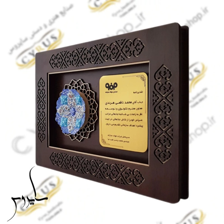 لوح تقدیر تندیس یا نماد و هدیه و یاد بود صنایع دستی لوح تقدیر دیواری با پشقاب مینا کاری فولاد مبارکه و ذوب آهن. تندیس