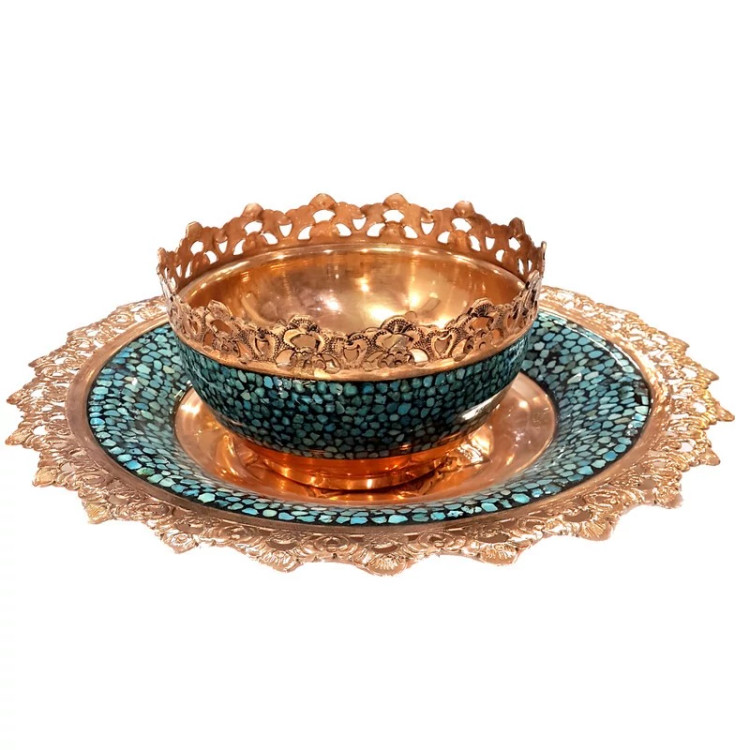 کاسه و پشقاب آجیل خوری لب شبکه ای قلم زنی شده مس و فیروزه کوبی نیشابور صنایع دستی سایروس