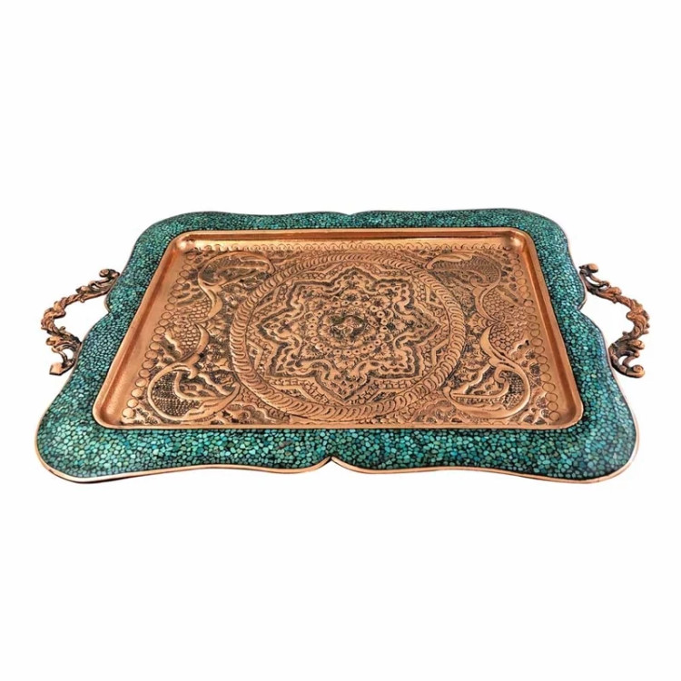 سینی چای خوری فیروزه کوبی و قلم زنی شده مس و فیروزه کوبی نیشابور صنایع دستی سایروس