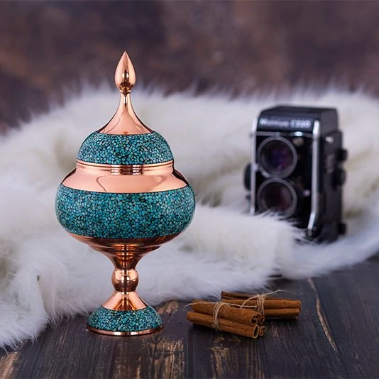 شکلات خوری فیروزه کوبی 25 قندان پایه دار فیروزه کوبی نیشابور و گز خوری مس و فیروزه کوبی صنایع دستی سایروس