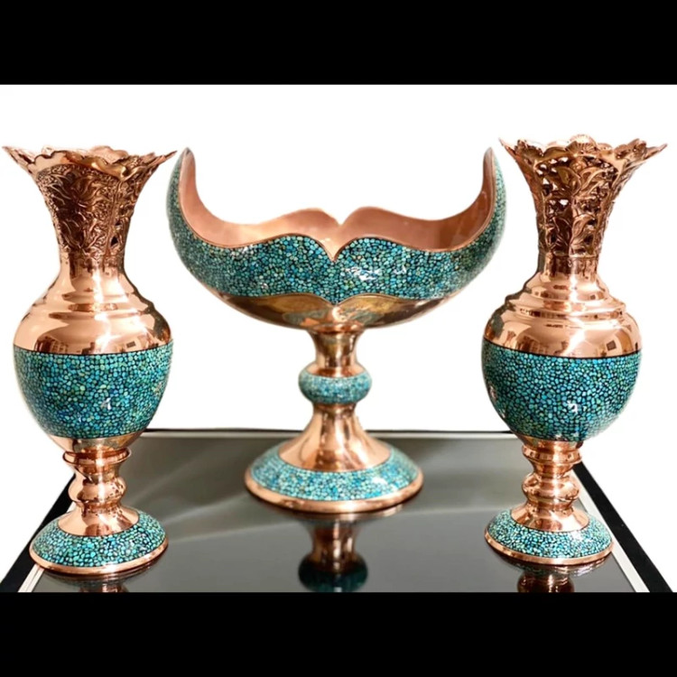 ست سه تکه سنبلدان و کشکول فیروزه کوبی 27 سانتی مس و فیروزه کوبی نیشابور صنایع دستی سایروس قلم زنی شده و لب شبکه