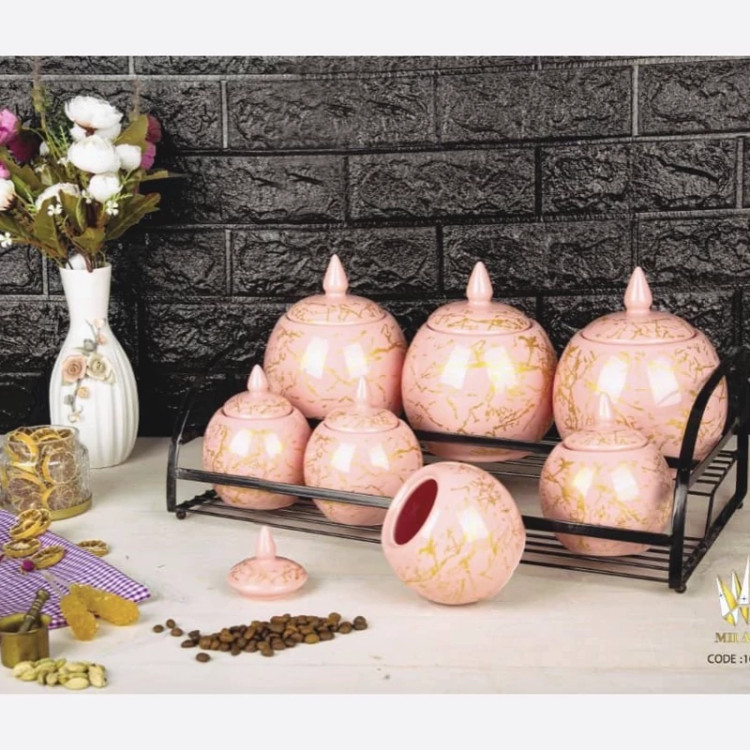 سرویس 7 پارچه پاسماوری دوما صورتی طلایی صدفی همراه استند