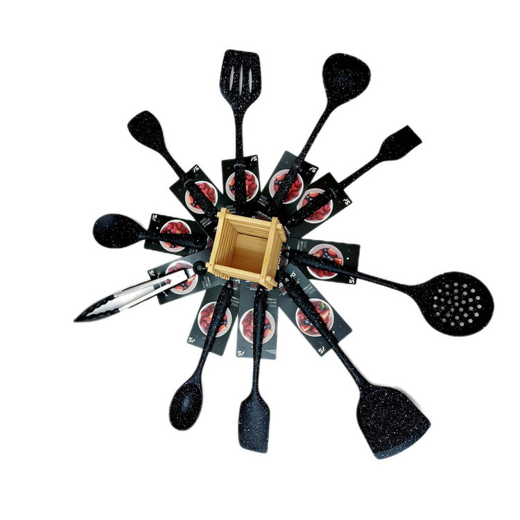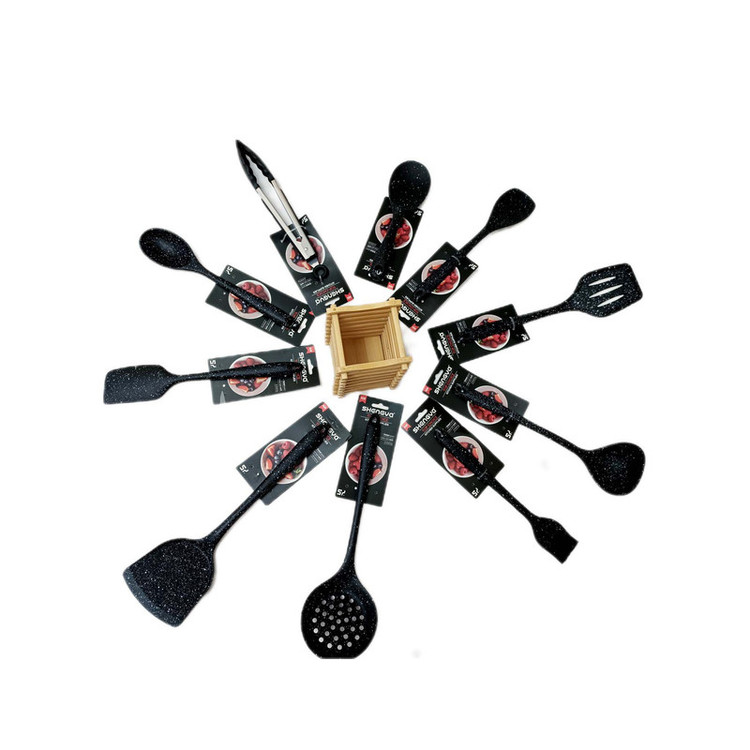 شامل انبر سیلیکون قفل دار, فرچه و لیسک بلند 26 .4, قاشق28.6 و کفگیر ساده 32.9و کفگیر سوراخ دار32.9 و کفگیر شیاردار30.8 ,ملاقه 32.9و کفگیر پارویی دسته کوتاه22.7 و کفگیر لیسکی 28.6 جا قاشقی بامبو