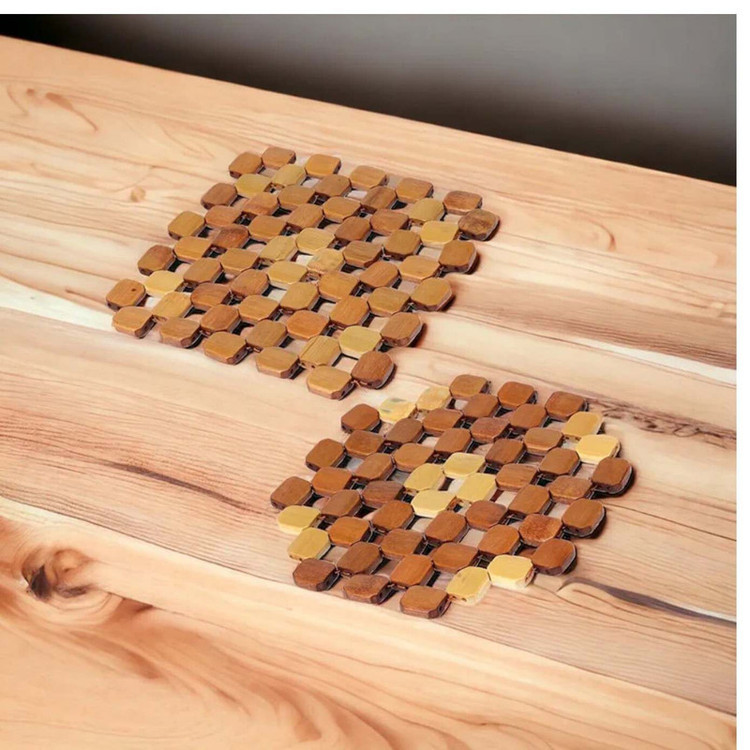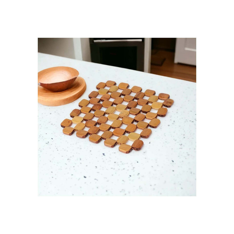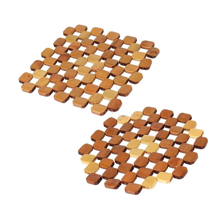 زیر قابلمه ایی BM88مربع ایی از جنس بامبو ساخت کشور چین میباشد دوخته شده از جنس نخ نسوز با تکه های 8 ضلعی بامبو است به ابعاد 19.19 و قطر تقریبا 1 سانتی متر میباشد. زیر قابلمه ایی BM87دایره ایی از جنس بامبو ساخت کشور چین میباشد دوخته شده از جنس نخ نسوز با تکه های 8 ضلعی بامبو است به ابعاد 20.20 و قطر تقریبا 1 سانتی متر میباشدکاملا نسوز و با دوام میباشد.