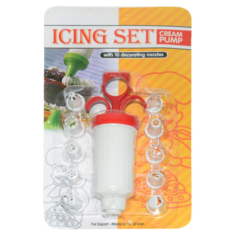 قیف خامه ریز ساخت کشور ایران مناسب برای تزیین انواع کیک و دسر مناسب برای شکل دهی حلوا و ماست چکیده دارای 10 عدد ابزار مختلف شکل دهی