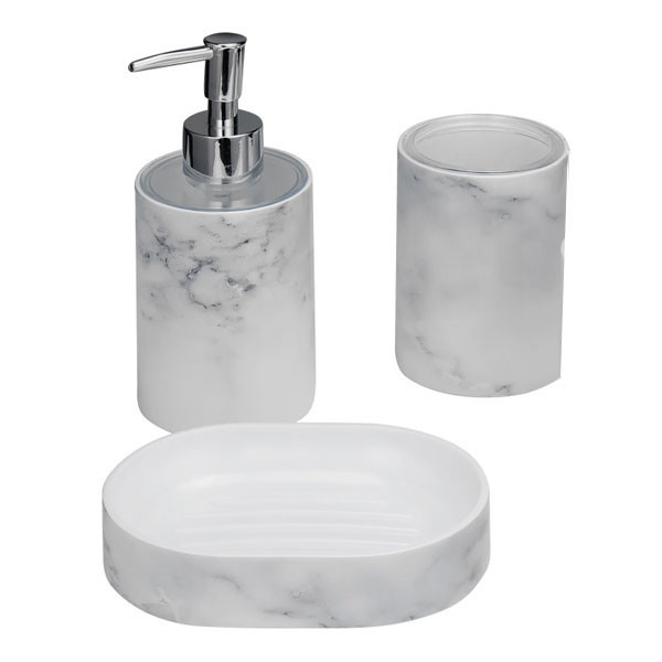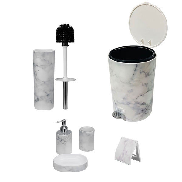 ست سرویس بهداشتی لیمون مدل ماربل مجموعه 6 عددی می باشد که شامل یک عدد جای دستمال کاغذی رولی دیواری به طول مربع 13 سانتی متر و یک عدد سطل به ابعاد قطر: 24 سانتی متر و ارتفاع: 27 سانتی متر و حجم: 4.5 لیتر می باشد . و یک عدد فرچه به قطر: 10 سانتی متر و ارتفاع: 39 سانتی متر و جامایعی به قطر: 7.5 سانتی متر و ارتفاع: 17 سانتی متر است.. همچنین دارای یک عدد جامسواکی به قطر: 10.5 ارتفاع: 7.5 سانتی متر و جاصابونی به عرض: 10 طول: 14.5 ارتفاع: 3 سانتی متر می باشد.