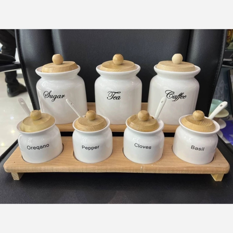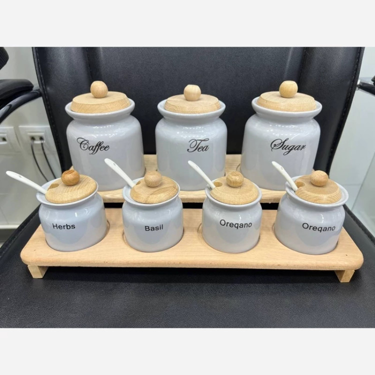 سرویس پاسماوری و ادویه سرامیکی 7 پارچه و استند چوبی تکست دار(پس کرایه)