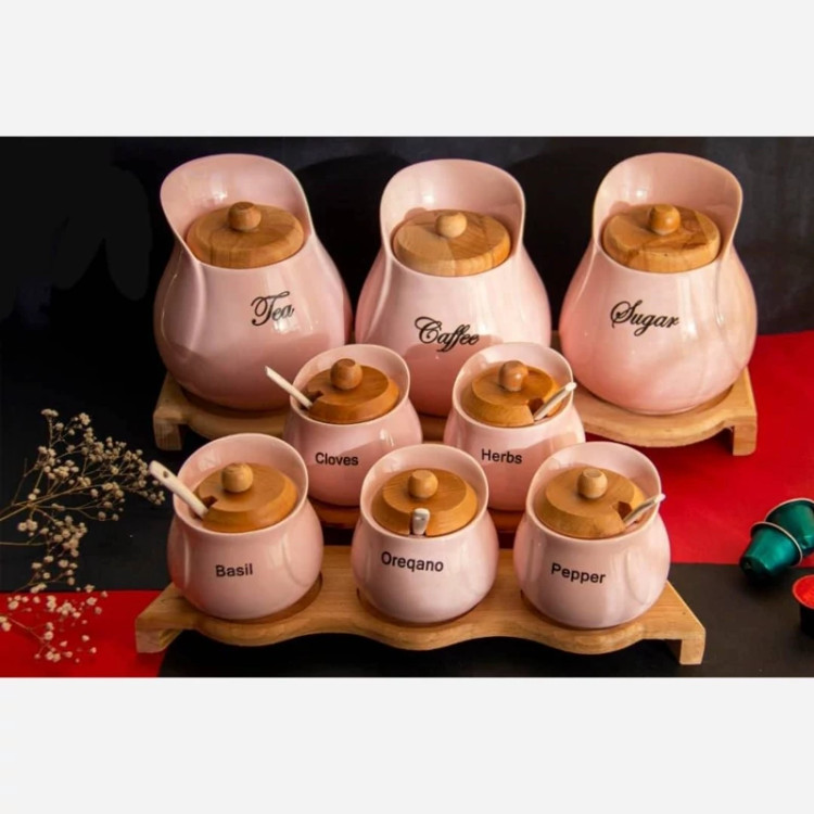 سرویس پاسماوری و ادویه یقه دار 8 پارچه سرامیکی و استند چوبی (پس کرایه)