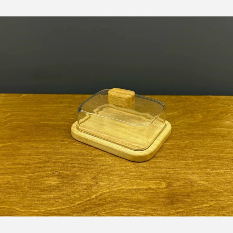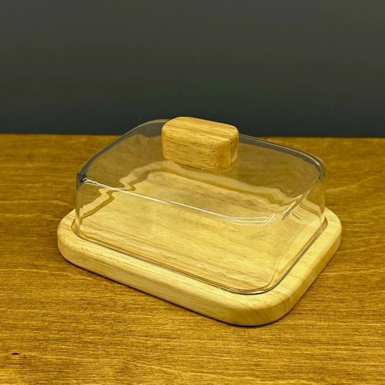 کفی آن از چوب رابر وود ( Rubber Wood ) که یک چوب بسیار محکم , ریز دانه با نقوش زیبا وجود برخی حفره های طبیعی است و از لحاظ دانه بندی و وزن می توان آن را با چوب بلوط مقایسه کرد ساخته شده است که مقاومت بالایی داشته و در صورت نگهداری صحیح برای مدت های طولانی قابل استفاده می باشد. این بخش شکلی مستطیلی دارد و ابعاد آن حدودا 15×12 و ضخامت آن کمتر از 2 سانتیمتر می باشد. درب این ظرف که از جنس اکرولیک شفاف و با کیفیت ساخته شده و دارای دستگیره ای چوبی می باشد به خوبی روی آن قرار می گیرد و ظرفیتی معادل یک قالب بزرگ 250 گرمی کره دارا می باشد. برای نظافت آن فقط کافیست تا از دستمال کمی رطوبت دیده استفاده نموده و در صورت خیس شدن بلافاصله خشک نمایید.