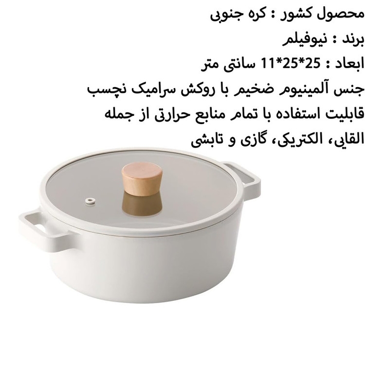 محصول کشور : کره جنوبی - برند : نیوفیلم - ابعاد : 25x25x11 سانتی متر - جنس آلمینیوم ضخیم با روکش سرامیک نچسب - قابلیت استفاده با تمام منابع حرارتی از جمله القایی، الکتریکی، گازی و تابشی