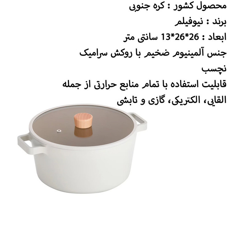 محصول کشور : کره جنوبی - برند : نیوفیلم - ابعاد : 26x26x13 سانتی متر - جنس آلمینیوم ضخیم با روکش سرامیک نچسب - قابلیت استفاده با تمام منابع حرارتی از جمله القایی، الکتریکی، گازی و تابشی