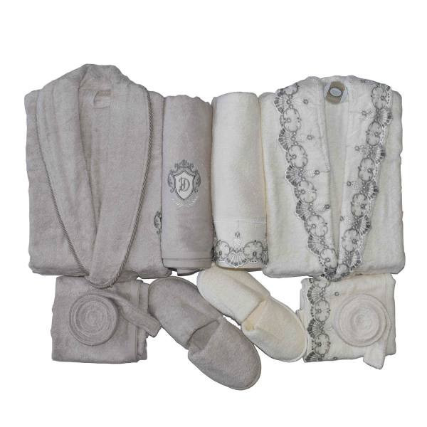 جنس: 60 درصد بامبو و 40 درصد پنبه می باشد. 2 عدد حوله دست و صورت : 50×90 سانتیمتر 2عدد حوله استخری : 90×150 سانتیمتر 2 جفت دمپایی حوله ای مردانه و زنانه مردانه( قد: 110 ،عرض شانه: 50، دورکمر: 120 ) زنانه ( قدی:100،عرض شانه:43 ، دورکمر : 100)