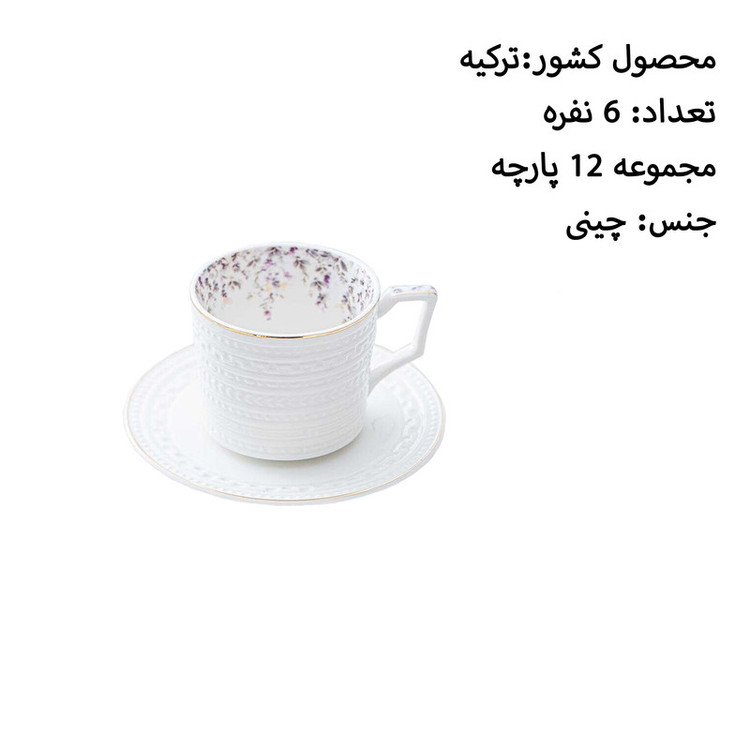 محصول کشور : ترکیه - تعداد : 6 نفره - مجموعه 12 پارچه - ابعاد فنجان : 8x8x7 سانتی متر - ابعاد نعلبکی : 14x14x1.5 سانتی متر - جنس : چینی - رنگ : سفید -