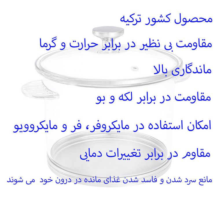 سایر توضیحات : محصول کشور ترکیه - مقاومت بی نظیر در برابر حرارت و گرما - ماندگاری بالا - مقاومت در برابر لکه و بو - امکان استفاده در مایکروفر، فر و مایکروویو - مقاوم در برابر تغییرات دمایی - مانع سرد شدن و فاسد شدن غذای مانده در درون خود می شوند