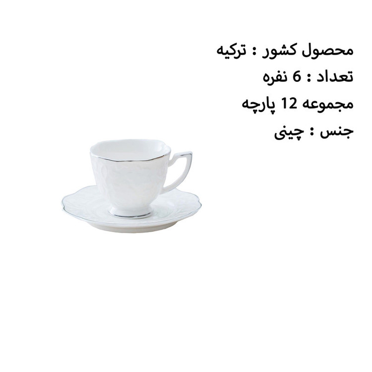 محصول کشور : ترکیه - تعداد : 6 نفره - مجموعه 12 پارچه - ابعاد فنجان : 9x9x7 سانتی متر - ابعاد نعلبکی : 15x15x1.5 سانتی متر - جنس : چینی - رنگ : سفید -