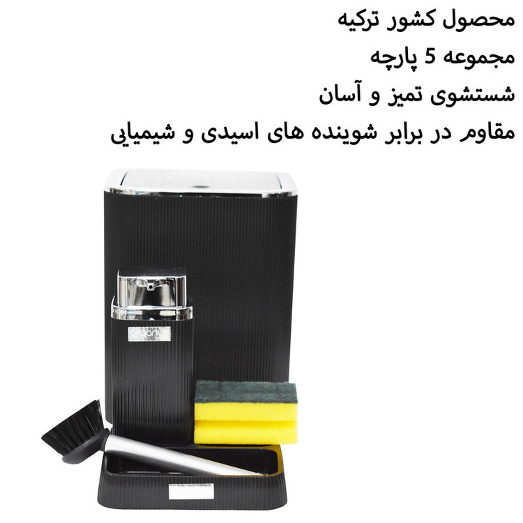 محصول کشور ترکیه -مجموعه 5 پارچه - شستشوی تمیز و آسان - مقاوم در برابر شوینده های اسیدی و شیمیایی - بسیار مقاوم وزیبا - سطل : 18x18x22 سانتی متر - جا مایع : 6x6x15.5 سانتی متر - فرچه : 14 سانتی متر - استند : 15x15x3 - به همراه اسکاچ