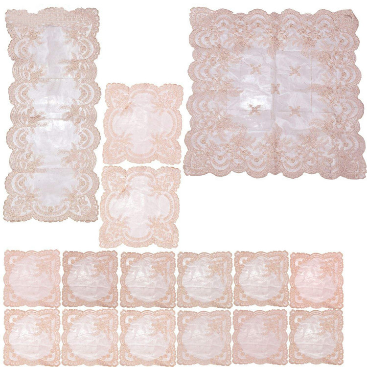 محصول کشور: ترکیه محصول 16 تکه شامل: یک عدد رانر بیضی:94×41 سانتی متر یک عدد رومیزی مربع بزرگ:80×80 سانتی متر 2 عدد رومیزی مربع متوسط: 40×40 سانتی متر 12 عدد رومیزی مربع کوچک: 26×26 سانتی متر