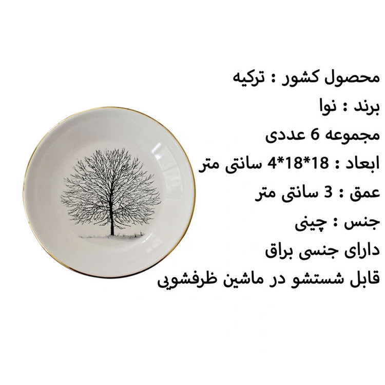محصول کشور : ترکیه - برند : نوا - مجموعه 6 عددی - ابعاد : 18x18x4 سانتی متر - عمق : 3 سانتی متر - جنس : چینی - دارای جنسی براق - قابل شستشو در ماشین ظرفشویی