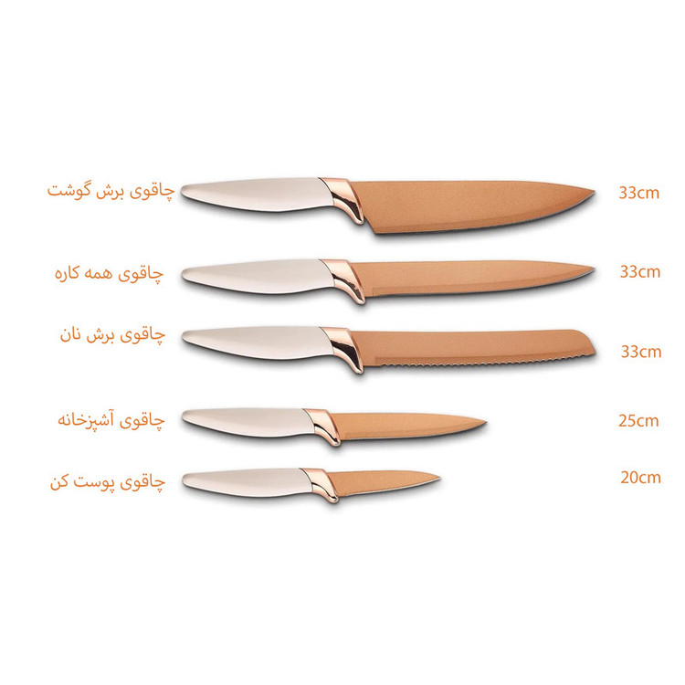 محصول کشور ترکیه - دارای تیغه فولاد ضد زنگ تیز - دارای دسته های باکالیت - چاقوی برش گوشت 33 سانتی متر - چاقوی برش نان 33 سانتی متر - چاقوی همه کاره 33 سانتی متر - چاقوی آشپز خانه 25 سانتی متر - چاقوی پوست کن 20سانتی متر - بسیار تیز و برنده