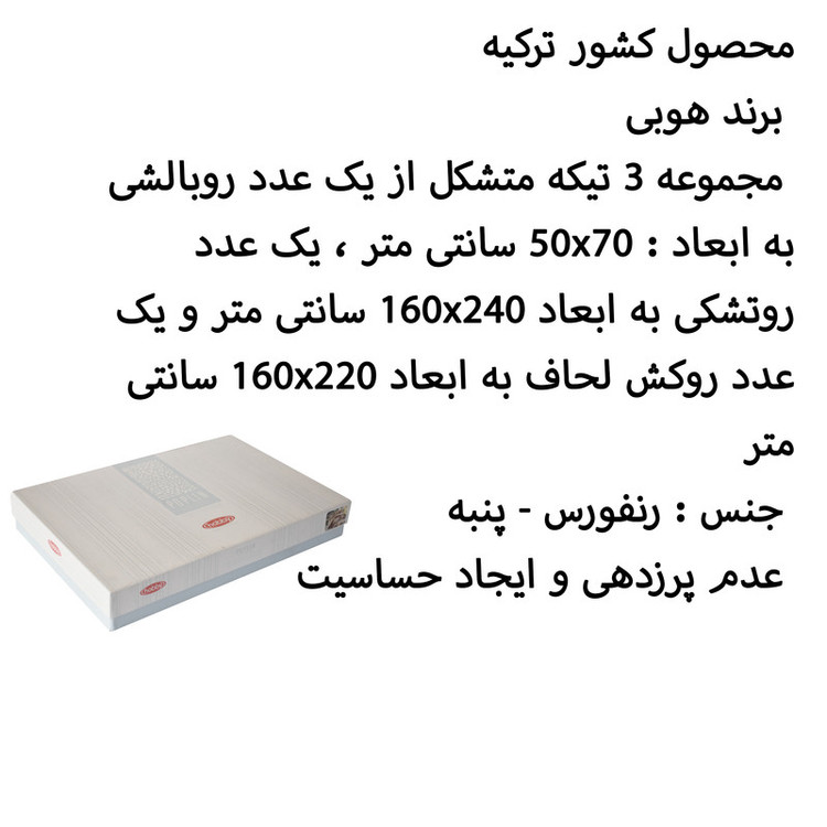 محصول کشور ترکیه - برند هوبی - مجموعه 3 تیکه متشکل از یک عدد روبالشی به ابعاد : 50x70 سانتی متر ، یک عدد روتشکی به ابعاد 160x240 سانتی متر و یک عدد روکش لحاف به ابعاد 160x220 سانتی متر - جنس : رنفورس - پنبه - عدم پرزدهی و ایجاد حساسیت